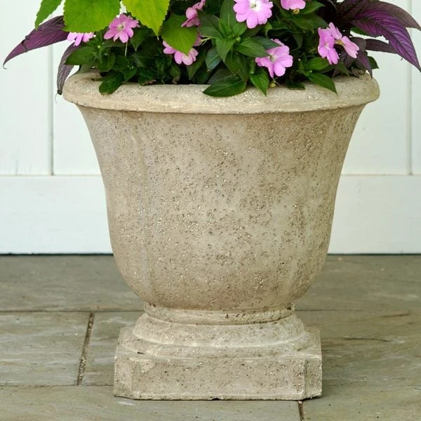 The sturdy proportions of this great looking urn make it ideal for plants with a large presence. We love it buried under Fern fronds or as a home to statuesque Colocasias or Ornamental Grasses. It’s made using natural volcanic ash, which makes it lightweight, durable, and weather resistant. The wide rim and chiseled base give it plenty of personality.