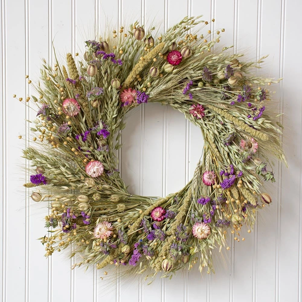 Earthy grains take center stage in our Avena Meadow preserved botanical wreath. Bunches of Flax, Millet, and Green Club Wheat join dried Avena to serve as an appealing neutral canvas for the characteristic saturated purple stripes in creamy Nigella pods, together with dried Lemon Mint blooms and Strawflowers in faded pink and amethyst hues; purple Sinuata finishes with dramatic pops of color, but refuses to overpower the lively arrangement. Enjoy your dried wreath indoors.