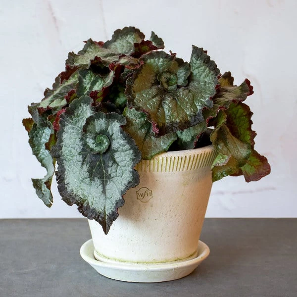 A bold spiral resembling a snail shell patterns each leaf of this easy-care Rex Begonia ‘Escargot.’ Rendered in rich bands of pewter, chocolate, and green, it creates an effect that will draw your eye from across the room. Pale pink flowers are an added pleasure. Makes a stunning houseplant. Grow in bright, indirect light with ample humidity and evenly warm room temperatures. Sent in a 8½” wide x 6½” tall handmade clay Farnham pot with matching saucer.