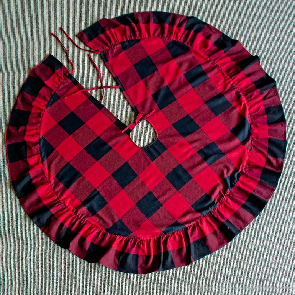 Add a warm finishing touch to your Christmas tree – and an ideal landing pad for gifts from Santa – with our Buffalo Country Tree Skirt. The iconic red-and-black buffalo-plaid pattern carries pleasant thoughts of small towns, country cabins, and being at home by the fire. Made of 100% cotton, this round tree skirt with ruffled edge measures 53″ in diameter and is machine washable. Consider other items in the Buffalo Country collection to create a complete look.