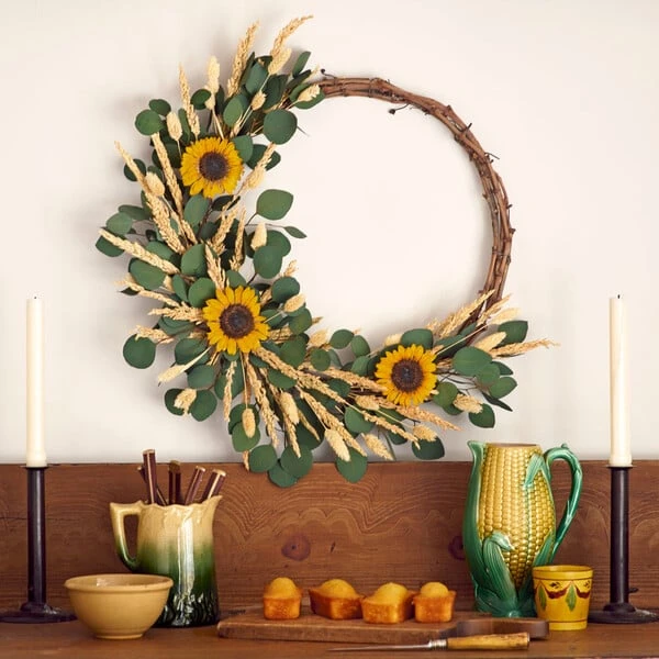 Our Burst of Sunshine Wreath features genuine dried Sunflower blossoms atop radiating sprigs of Sorghum and Phalaris and clusters of blue-green Silver Dollar Eucalyptus. The exposed portion of Grapevine base adds to this asymmetrically designed wreath’s simple, rustic feel. Try rotating the wreath in different directions to achieve a variety of looks.