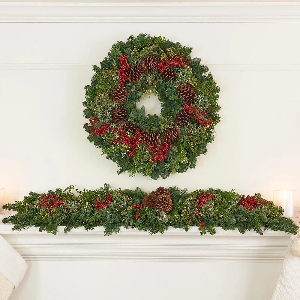 Fresh Noble Fir is a favorite part of our holiday tradition, and our Canella Berry and Cone Runner starts with a robust base made from its bluish green branches. We then add Incense Cedar with tiny, golden cones, Arborvitae, large Ponderosa Pine cones, and sprigs of silvery gray Juniper berries. Bright red Canella berries provide the finishing touch. Perfectly sized for a mantelpiece, long table, or sideboard, where you can enjoy its color and scent up close. Measures approximately 7″ wide x 48″ long x 3–4″ thick. Sustainably harvested.