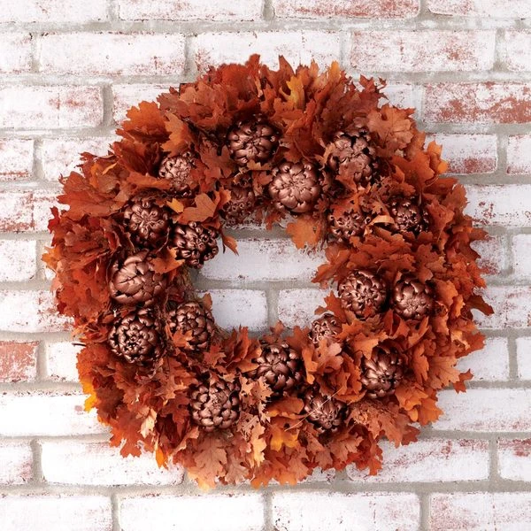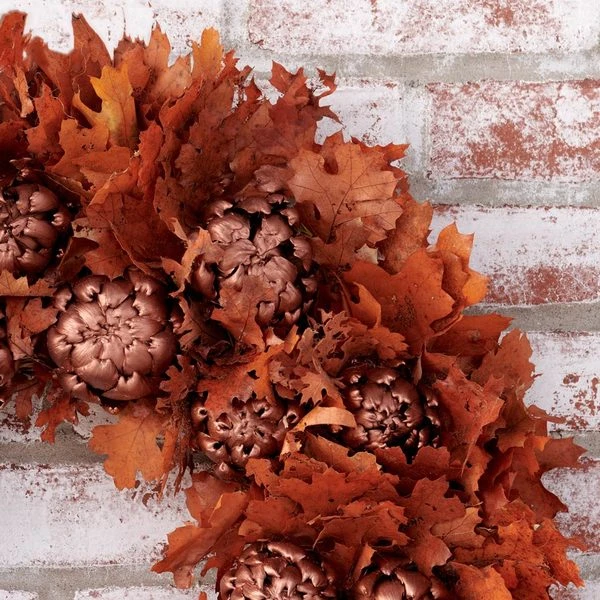 Shimmering metallic copper-painted Artichokes nestle within clusters of natural Oak leaves on a wreath that simply shouts autumn. This unabashedly festive wreath is handmade in natural and preserved materials on a twig base, to enjoy all season long.