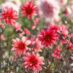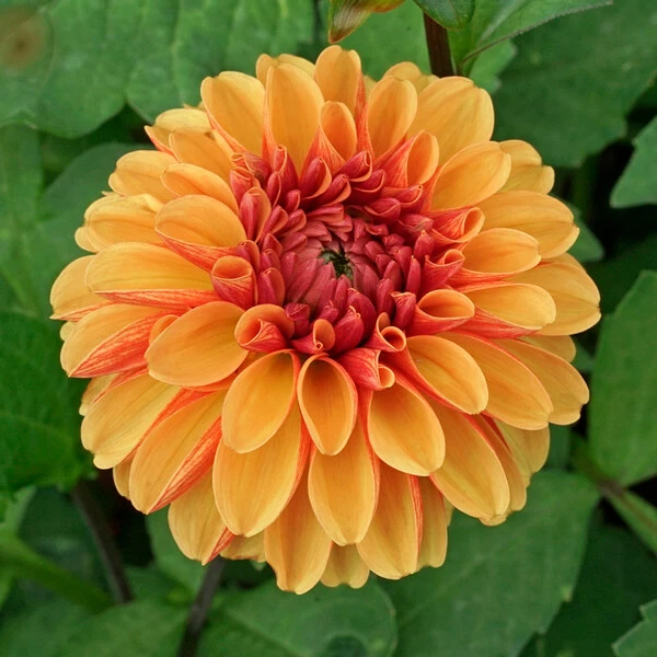 The 4″ Formal Decorative blossoms of Dahlia ‘American Sunset’ bring exceptional radiance to the summer and autumn garden, the cantaloupe color of each petal intensified by a red-orange underside that creates a two-tone effect. The flowers are carried on dark stems for an added color accent. The plants are vigorous, medium-height, and excellent for flower arrangements.