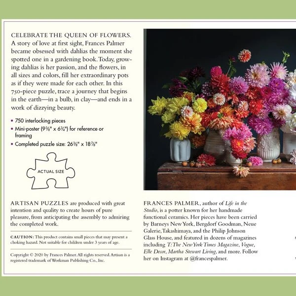 Enjoy long hours of entertainment completing this jigsaw puzzle, featuring a colorful image of ceramist Frances Palmer’s clay vessels overflowing with brilliant Dahlias. The artful scene celebrates Palmer’s passion for Dahlias and pottery, in 750 interlocking pieces. This puzzle also makes a thoughtful gift for the gardener on your list.