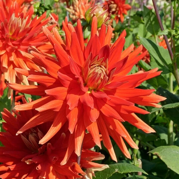 Looking for a little heat in the summer and fall garden? Dahlia ‘Vulcan’ will turn up the voltage. The large (up to 11” wide) spiky, Semi-cactus blooms are a sizzling shade of orange-red with flickers of yellow in the center and at the tips of the petals. Sturdy dark purple stems support these dynamic blooms, which are a four-alarm addition to borders and bouquets.