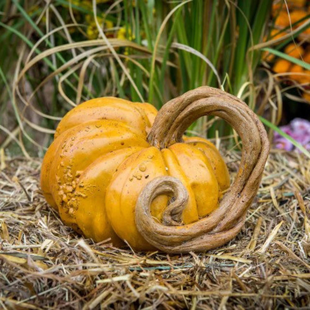 Our stone Pumpkin makes a plucky little addition to your autumn garden décor. Initially hand sculpted in clay, the Pumpkin is then cast in stone to show off its lifelike features, from the realistic ‘warts’ to the curlicue vine wrapping around the ribs. The ocher yellow Pumpkin is made in sturdy Glass Fiber Reinforced Concrete (GFRC) to endure temperature extremes outdoors, but looks as fetching indoors, adding seasonal character wherever you choose to arrange it.