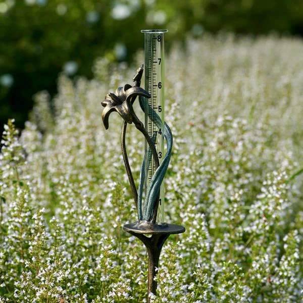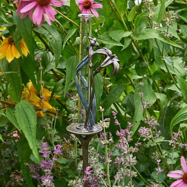 An alluring flower does double duty attracting a busy bee and embracing the glass rain watcher atop this enchanting sculptural garden stake. At once artful and purposeful, the distinctive rain gauge adds interest to your garden, and collects up to eight inches of precipitation. Situate the outdoor-safe stake in any large planter or bed.