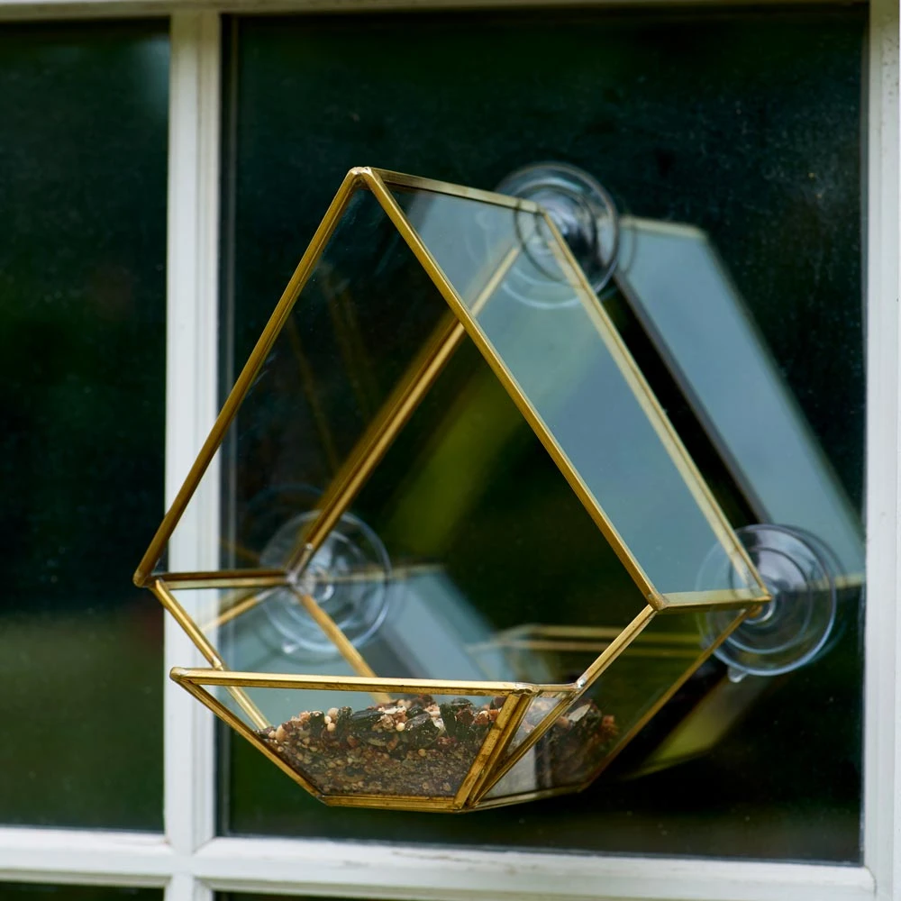 The unique design of this elegant glass and brass window bird feeder offers a closeup view of avian activity all year. Attract a variety of species with seasonally appropriate food, including seed, suet, oranges, or peanuts. Leave the feeder outside in any weather – its glass remains clear, the brass never rusts, and the accompanying suction cups are UV-protected.