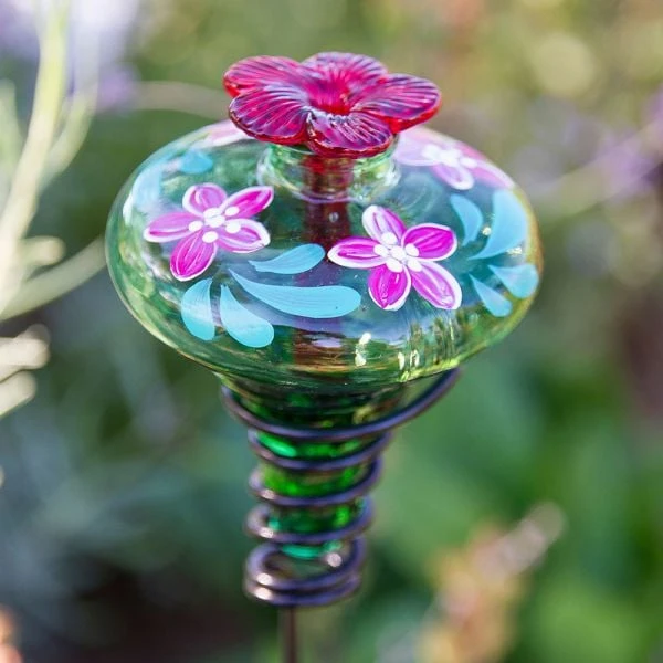 Recycled green glass is handblown in the shape of a blossom and painted by artists in Mexico to create this brightly colored, beautifully constructed nectar feeder for hummingbirds. The flower-like reservoir is secured by a metal stand that pushes easily into the ground. Instructions for filling, cleaning, and making nectar are included with the stand and feeder. Please note: Because the blossoms are painted by hand, each is unique.