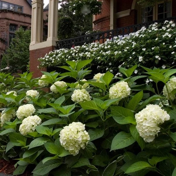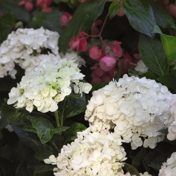 Endless Summer® marked a breakthrough in Bigleaf (macrophylla) Hydrangeas by flowering in spring on old wood and then in summer on new wood. Blushing Bride® is a white-flowered sibling with the same dark green leaves and 9″ flowers, but an earlier rebloom. The flowers of Blushing Bride® can age to a pinkish blush depending on the pH of your soil. PP 17,169