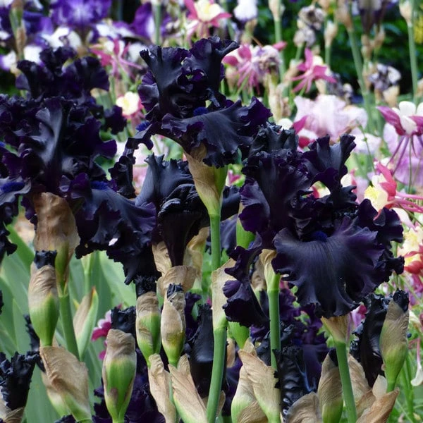 The nearly black, generously ruffled blossoms of Iris germanica ‘All Night Long’ add definite drama to the late spring garden. The flowers flaunt attractive purple beards and emit a light fragrance, too. This showstopping Tall Bearded Iris is sure to capture the attention of your garden guests. Multiple award-winner.