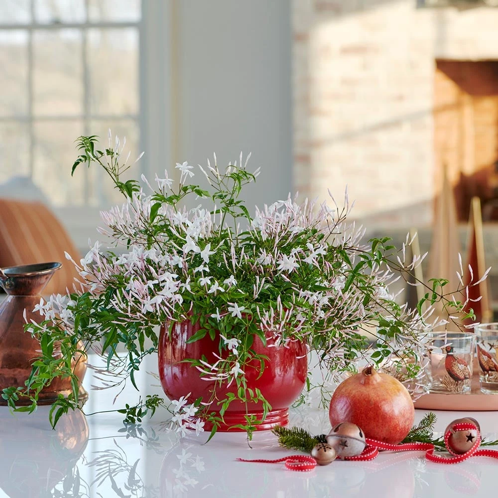 Our fully-budded Jasmine plants open their sweetly fragrant, white flowers in midwinter. We offer a bushy plant set in an 8″ clay pot with a shiny, candy-apple red foil finish. We ship your order with complete care instructions.
