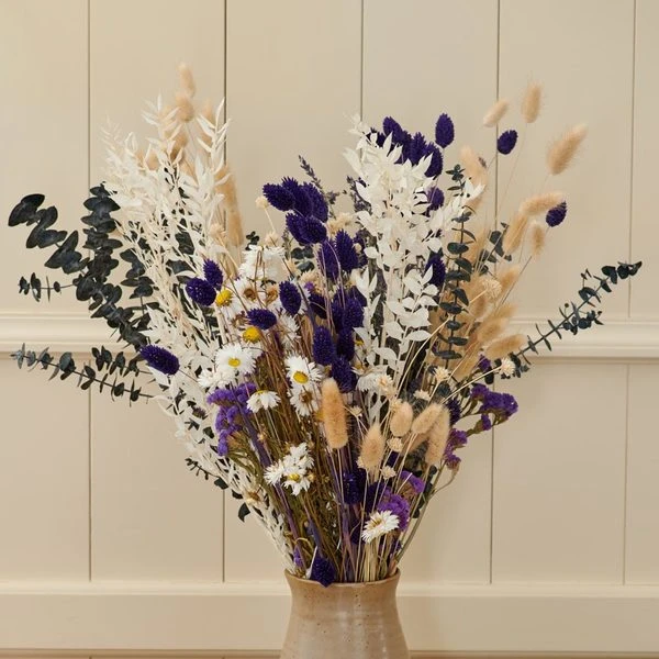 This elegant bouquet of preserved florals features purple in varying hues, from its demure dried Lavender to show-stopping violet Phalaris; makes a striking focal point on a dining or occasional table. Arrangement comes with a half bunch each of Violet Phalaris, natural Bunny Tail, and dried Lavender; two bunches of bleached Ruscus; one-third bunch of bleached Hill Flower; four stems of preserved Eucalyptus; and five stems each of preserved White Daisy and Purple Statice. Bouquet also makes a thoughtful gift. Approximately 28″ tall.