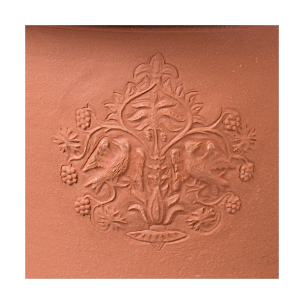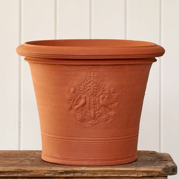 The great British designer William Morris once said: “Have nothing in your house that you do not know to be useful or believe to be beautiful.” Whichford Pottery’s Lovebirds Pot takes its inspiration from two of his designs, which are reimagined here in a classic medallion featuring two lovebirds amid an artful accent of grapevines. We recommend the use of larger bark mulch or a wire mesh screen to cover the drainage hole.
