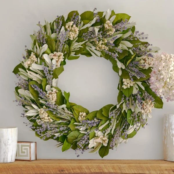 Bunches of dried Lavender, clusters of white Statice, and the lance-shaped leaves of Integrifolia adorn the beautiful Montecito Floral Wreath, adding textural layers to a ring of matte green Salal leaves atop a twig base. This is a lovely, lasting indoor accent for any room, in any and every season.