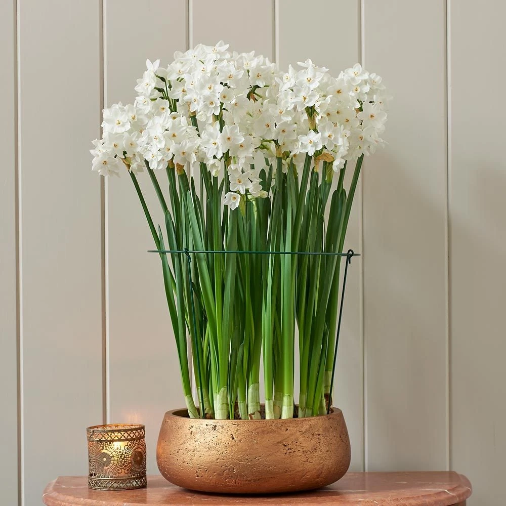 Timeless beauty, sweet perfume, and absolute dependability have made Paperwhite Narcissus the all-time favorite bulb for forcing indoors in winter. In this kit we deliver large bulbs and a copper-toned ceramic bowl, and you can plan on enjoying clusters of 14-18 pure white blooms 4-6 weeks from potting.