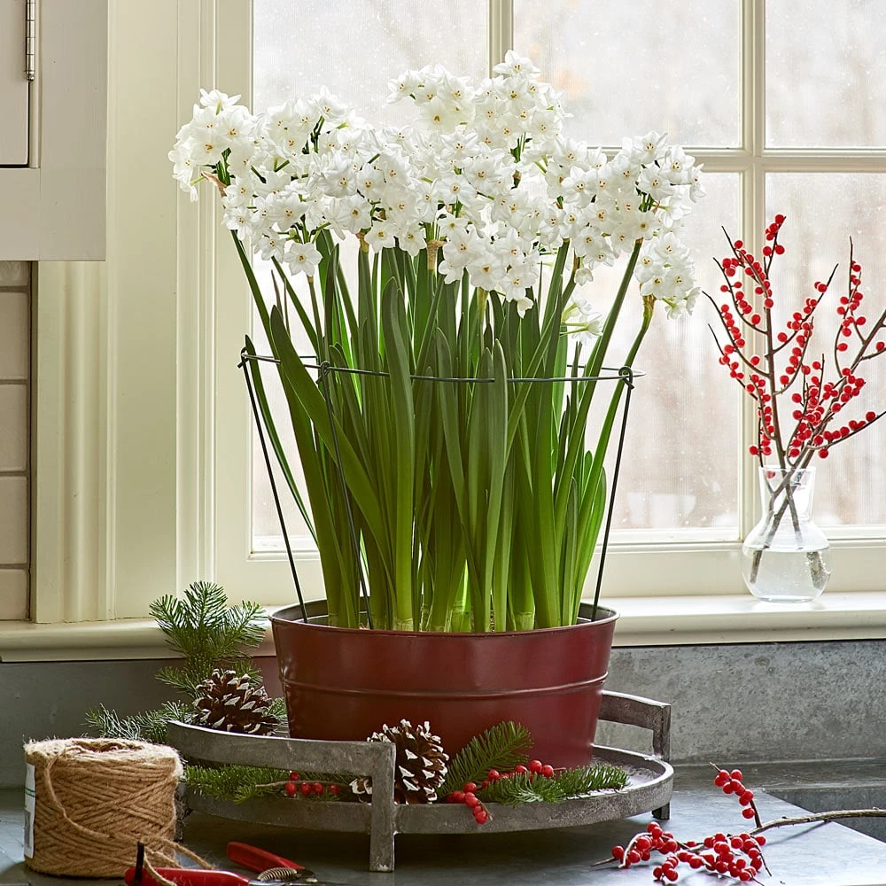 Paperwhites require no preparation and are absolutely foolproof. When bulbs are planted in early December, they will flower in 4-6 weeks with seldom a miss. If you start your plantings at 2- to 4-week intervals you can keep the show running all winter. Bulbs may be held for weeks in a warm, dark closet, which allows plenty of flexibility in orchestrating displays for holidays or other special occasions. Please note: Paperwhites can be planted outdoors if your climate permits. They are winter hardy to Zone 8 (10°F) and will endure all but the harshest of winters in Zone 7 (0°F).
