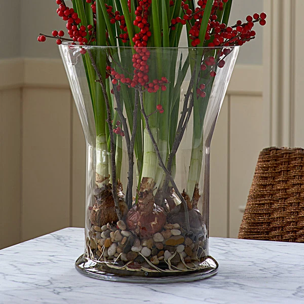 The fragrant, snowy white clusters of Paperwhites make a dramatic centerpiece or holiday bouquet, especially when paired with the red berries of Winterberry Holly (Ilex verticillata) in our wide hurricane vase. Our Winter Solace Kit includes everything you need to grow these festive bulbs all season.