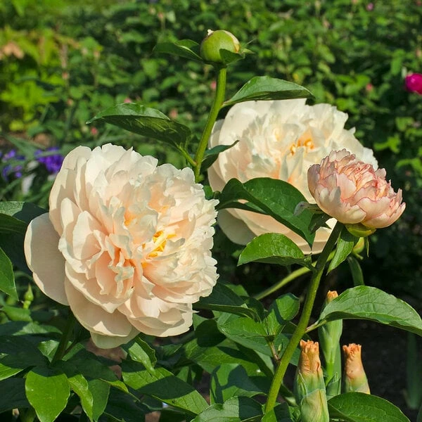 Peony ‘Pastelegance’ is a cross between Peonies ‘Salmon Dream’ and ‘Lemon Chiffon.’ This beauty produces elegant double blossoms in tones of pale pink and cream, adding considerable romance to the spring garden and bouquets. Stamens are woven throughout the blooms, which are held on sturdy stems and framed by generously sized glossy green foliage. Winner of the American Peony Society’s grand champion or “Queen of the Show” prize. Midseason.