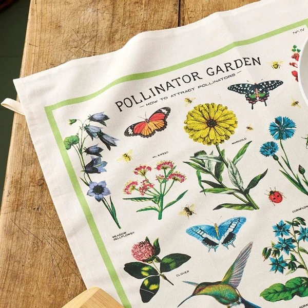 This 100% natural cotton tea towel is soft, absorbent, and perfect for kitchen use, but it might equally be considered wall art with its colorful, vintage illustrations of pollinators and their preferred flowers. The delightful drawings also serve up bits of garden wisdom: bees like Borage, butterflies adore Milkweed, hummingbirds love Salvia, and so on (see the informative “key” at the bottom of the towel for more). The artistic yet functional towel, with a cotton twill loop for convenient hanging, is ready for gifting in a muslin drawstring bag.