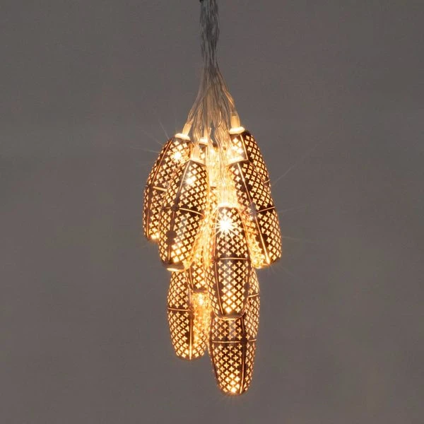 Pretty pendants by day, these solar string lights are made of copper-colored, weather-resistant metal that’s punched with an intricate pattern of tiny stars that emit a warm glow as soon as the sun sets. Each of the lights is a stylish cousin of a Moroccan lantern. With 10 on each 15-foot strand, they’ll light up your evening patio or garden. Solar panel wired to recharge battery.