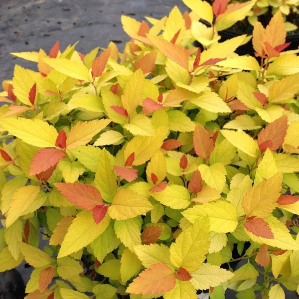 With a changing color palette borrowed from a favorite Halloween candy, Spiraea japonica Double Play® Candy Corn® is an eye-catching little shrub that greets spring with brilliant red foliage. As the season progresses, the leaves turn sunny yellow with new growth emerging orange. Red-violet flowers in late spring and early summer make this flamboyant member of the Double Play® Series a visual treat. A Proven Winners®/Color Choice® variety. ‘NCSX1’ PP 28,313