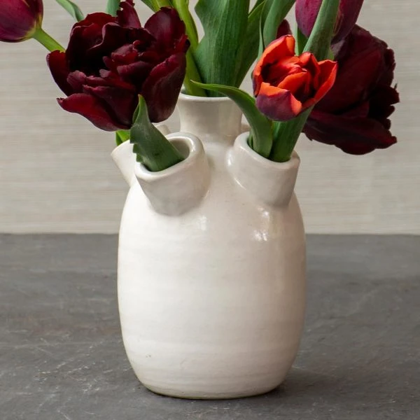 American artist Francis DeFabo makes this unique Three Rivers Handmade Ceramic Tulipiere, an attractive and sturdy vessel for displaying your favorite cut flowers. A combination of wheel-throwing and hand-building techniques results in the five separate spouts on the smooth, glossy pottery. The special configuration and size of the spouts help support each stem in your cut arrangement. Expect some variation in the handmade Tulipiere, which only adds to its distinctive character. The pottery is fully glazed for water-tightness, in creamy neutral white.