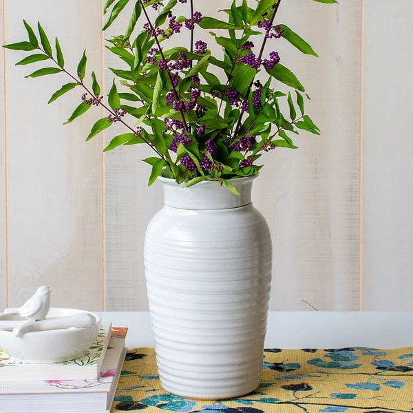 Petite clusters of ridges draw the eye to this exquisite handmade vase, the work of ceramicist Francis DeFabo. The lid rests inside the vase, and features a flower frog with quarter-inch holes to support the stems in your cut arrangements. This fully watertight vessel comes in a creamy white glaze to set off colorful blossoms and vibrant greenery. The lid removes completely for easy cleanup. Handcrafted in the USA.
