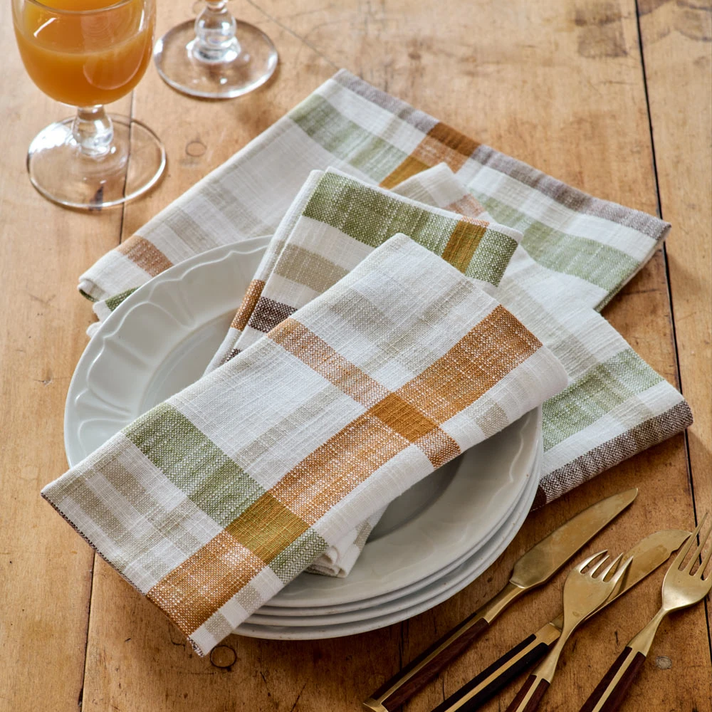Fall shades of pumpkin orange, sage green, and cider brown intersect at well-spaced intervals to create the timeless, harvest-inspired plaid that defines our 100 percent cotton Vintage Autumn Plaid Napkins. The napkins are soft to the touch and highly absorbent, and they add seasonal flair to table settings. Use them alone or complete the look with our Vintage Pumpkins Table Runner and Golden Pumpkin Napkin Rings.