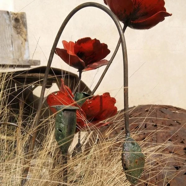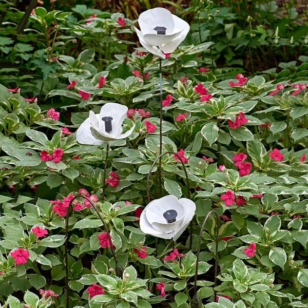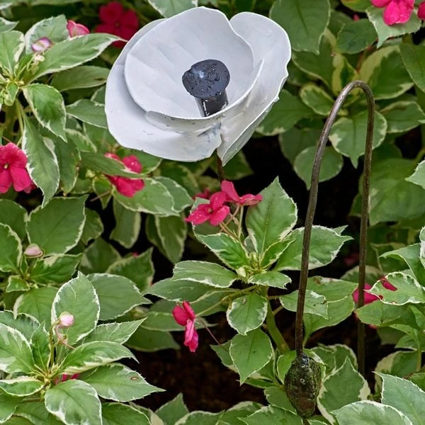 Add to your garden’s attractions or support heavy blossoms with these charming garden stakes. Fashioned from recycled metal, they feature a single, large white Poppy affixed to a semi-rigid rod. The flower is cut, shaped, detailed, welded, and painted by hand. The neutral color goes with everything in the garden. The stakes can be used to support living plants indoors or out, and they can be massed to create a small-scale Poppy field. Due to the handcrafted nature of each piece, stakes vary in length from 26-33”. Stakes are weather resistant, but leaving them outdoors in winter may result in the gradual development of rust. Includes a 2-stake set: 1 Poppy blossom stake accompanied by 1 Poppy pod or bud stake.